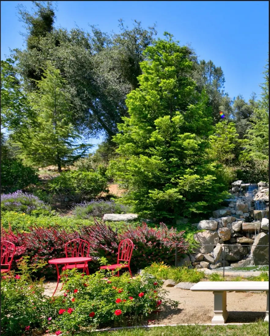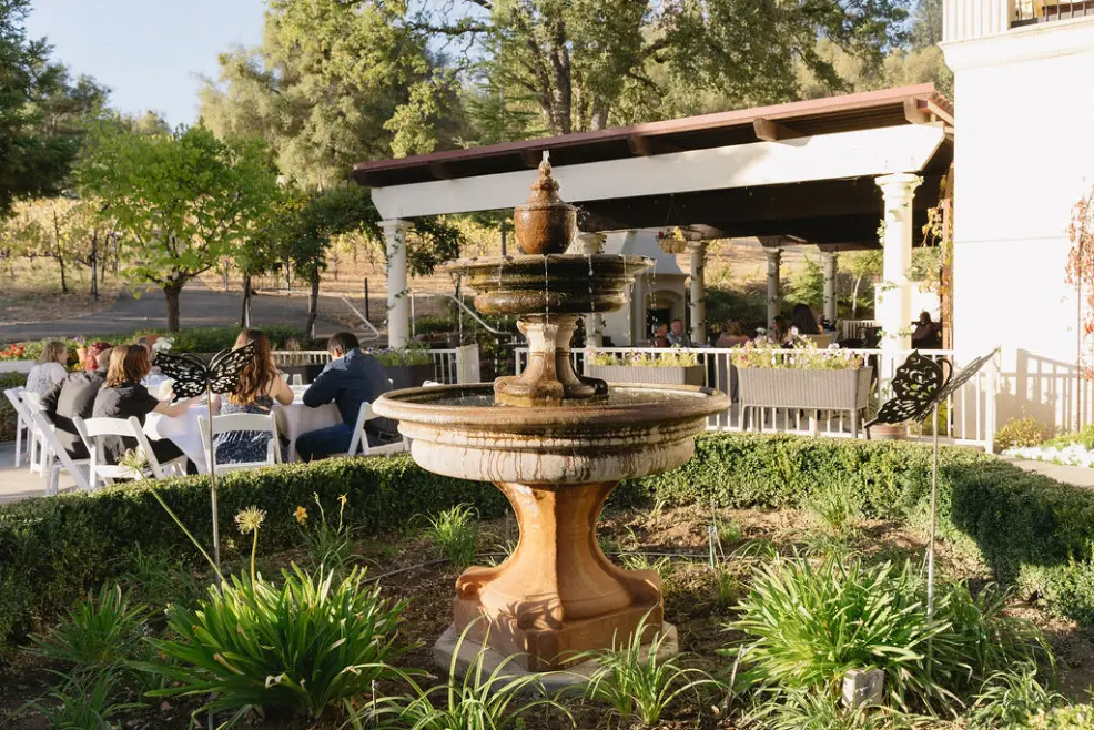 The Waterfall Terrace is tucked within the estate’s gardens and vineyard landscape. The waterfall is a peaceful focal point, surrounded by greenery and vineyard views that frame the space.